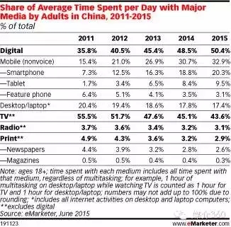 据eMarketer的最新报告,2015年中国用户所有媒体每天总用时为6小时08分。其中: