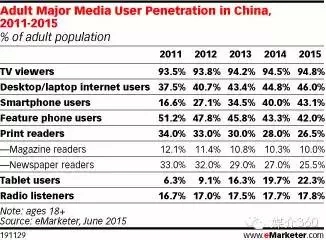 2015年,在18岁及以上中国成年人中,传统电视的渗透率达94.8%,遥遥领先于其他媒体。但使用时间却呈缓慢下降趋势,这表明电视的开机比率在逐步走低。