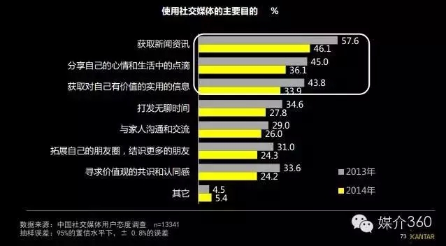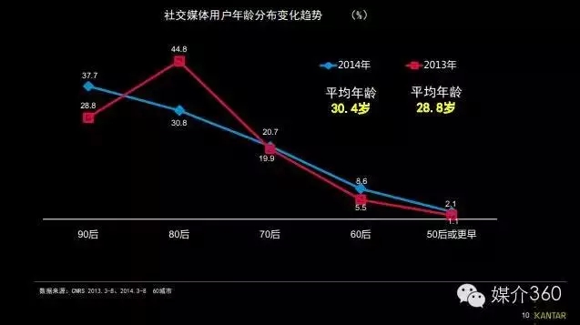 根据凯度发布的《2015中国社交媒体发展报告》,社交媒体用户呈现快速增长态势,日趋主流。社交媒体用户在城市居民中的百分比已经从2013年的28.6%上升到2014年的34%。社交媒体用户年龄结构呈现多元化:90后成为最大人群,70、60、50后份额均呈现不同幅度的增长。