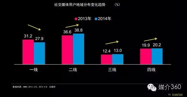 社交媒体用户地域分布呈现多元化:一线城市比例下降,二三四线城市均有不同程度的增长。