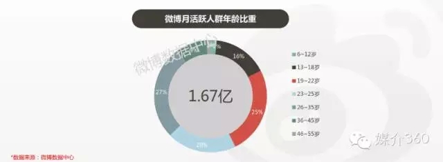根据《2014年微博用户发展报告》,截止2014年9月30日,微博月活跃用户数(MAU)已经达到1.67亿人。微博用户年龄结构较为均衡:从月活用户的年龄比重上看,19-35岁用户占月活跃用户总量的72%,80、90后为微博活跃用户主体,且年轻化用户有较为明显的增长趋势。
