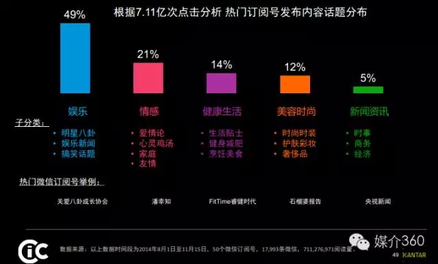 微信热门订阅号按内容分类中,娱乐,健康生活,新闻资讯以及美容时尚类订阅号占据了80%的份额。除日常发帖,42%的订阅号还会通过微社区或微讨论功能与粉丝互动。其中,娱乐类内容最受微信用户的追捧。