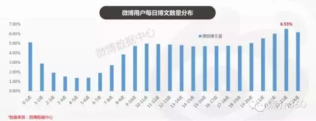 微博用户每日发布的博文数据中不难看出,微博用户发布博文行为主要集中于一般用户活动时间内(6点至24点间),而博文发布的最高点位于晚间时分,其中22-23点间为用户发布博文的最高时段。