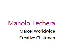 作为南美广告界的大师MannoloTechera,也被称为“固有观念的破坏者”必然也是本次广告节审查委员会的一员。ManoloTechera在全球第一家广告公司也是全球第一家开展国际化作业的智威汤逊广告(墨西哥)公司担任副总裁期间,创立了 Marcel Worldwide,以创新的数字化品牌战略负责了全球各大知名品牌的广告代理。