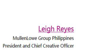 作为MullenLowe GroupPhilippines的首席兼首席创意官Leigh Reyes,先后获得戛纳,D&AD,金铅笔国际创意节,克里奥国际奖, Spikes亚洲广告节,亚太广告节,LIA,纽约广告节,纽约艺术指导协会,亚太区数码传媒大奖等广告节的认可,曾在戛纳,LIA,亚太广告节等作为陪审团目前MullenLowe GroupPhilippines的董事会成员,今年将作为艺术指导俱乐部陪审员及克里奥(Clio)陪审员。